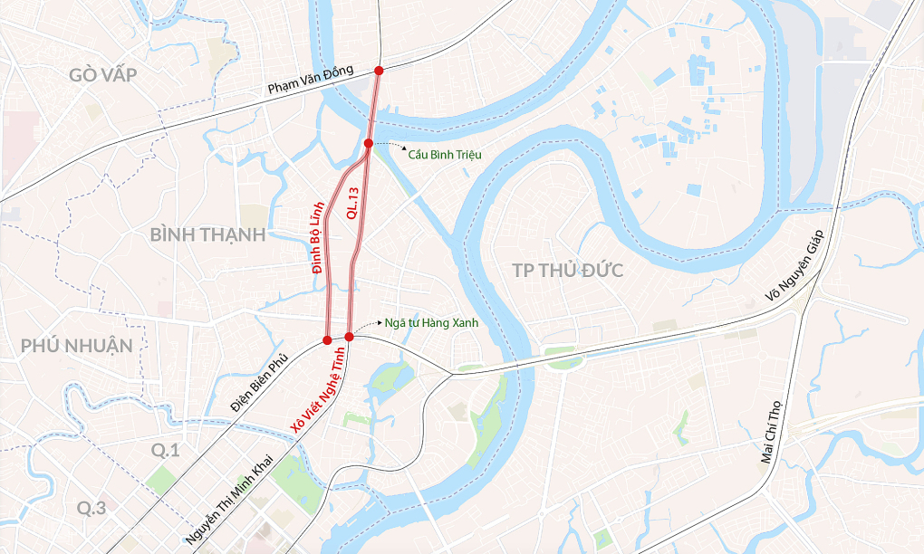 Song song trục đường trên, tuyến Đinh Bộ Lĩnh cũng dự kiến được nâng cấp đoạn dài hơn 2 km từ nút giao Phạm Văn Đồng đến Điện Biên Phủ. Mặt đường sẽ mở rộng lên 25 m và xây mới cầu Bình Triệu quy mô 6 làn xe, tổng vốn khoảng 2.900 tỷ đồng.
